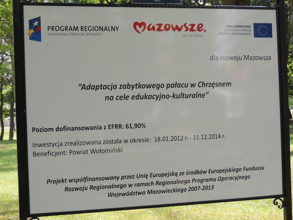 W 2008 roku aby zapobiec dalszej degradacji, powiat wołomiński podjął decyzję o rewitalizacji zespołu pałacowo-parkowego w Chrzęsnem (gm. Tłuszcz). Przez lata nieużytkowany popadał w ruinę. Wszystkie prace jakie były przeprowadzone w latach 2009-2014 prowadzone były pod czujnym okiem konserwatora zabytków. Zadbano, aby budynki zespołu zachowały swój historyczny charakter, ale też przystosowano je do nowych funkcji wyposażając w nowoczesne rozwiązania techniczne na miarę XXI wieku. Wyposażony został w nowoczesne media, systemy informatyczne i zabezpieczające. Dzięki staraniom ówczesnych włodarzy powiatu wołomińskiego i dofinansowaniu ze środków unijnych późnorenesansowy pałac w Chrzęsnem wraz z otaczającym go parkiem odzyskał dawną świetność i dziś jest wizytówką regionu. Pałac został przeznaczony na cele publiczne, przez co stał się dostępny dla szerokiego grona odbiorców, dostosowano go również do potrzeb osób niepełnosprawnych.