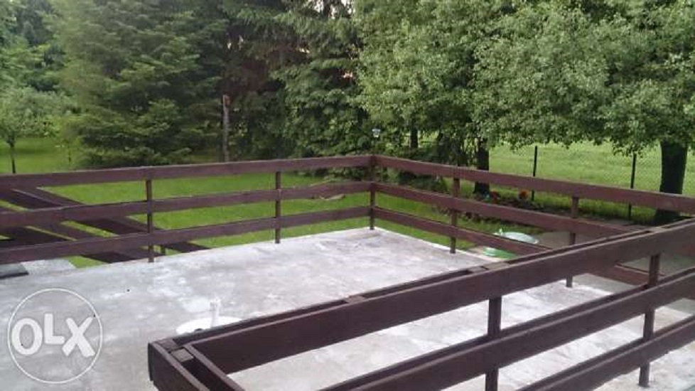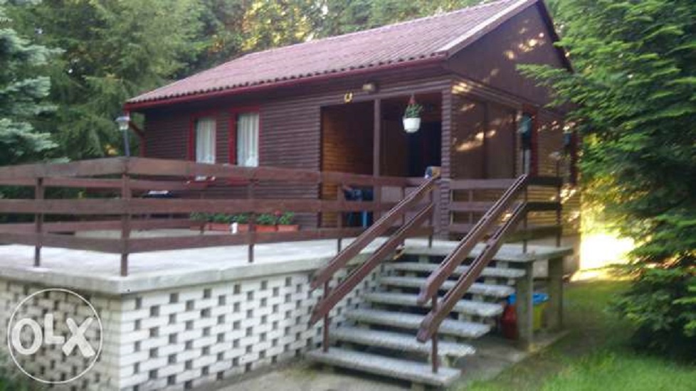 Dom letniskowy z tarasem, na dole salon z kuchnią.