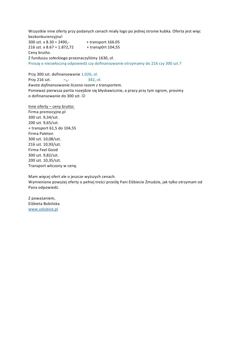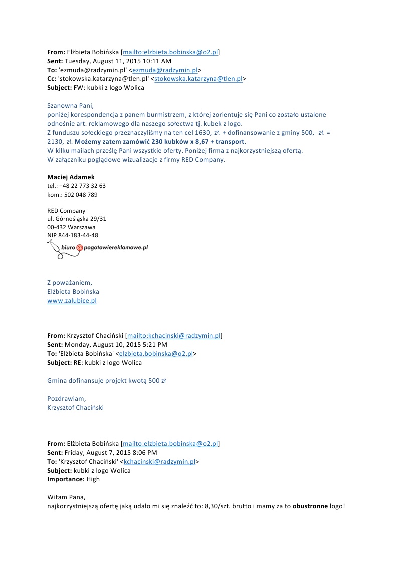 Korespondencja w spr. dofinansowania kubków z logo sołectwa Szczegóły Opublikowano: czwartek, 29, październik 2015 20:05 Super User