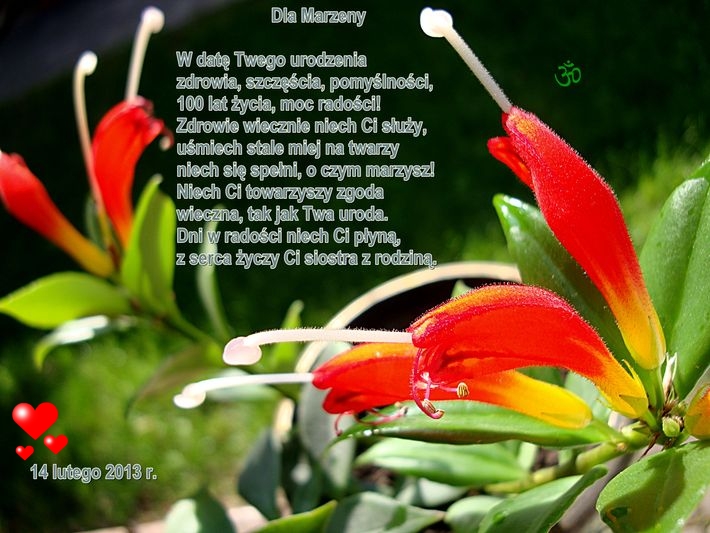 Wierszyk lub własne, autorskie życzenia można zadedykować ukochanej osobie, przyjaciołom, znajomym. Prześlij je na kilka dni przed datą publikacji (np. urodziny, imieniny, jubileusz, inne) dopisując koniecznie kto jest autorem życzeń i dla kogo są przeznaczone. Nie zapomnij powiadomić o tym odbiorcy życzeń np. kopiując pasek adresu lub w każdej innej formie.