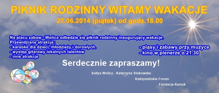 Zaproszenie na piknik rodzinny Szczegóły Kategoria: News Opublikowano: wtorek, 24, czerwiec 2014 10:33 Super User