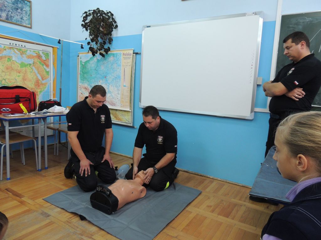 Uczniowie zapoznali się ze sposobami udzielania pierwszej pomocy osobom poszkodowanym w różnych wypadkach. Omawiano kolejność czynności jakie należy podjąć przystępując do pomocy osobie poszkodowanej.