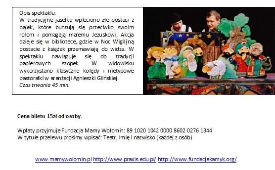 "Bajkowa Szopka" spektakl dla dzieci Szczegóły Kategoria: Fundacja Kamyk Opublikowano: czwartek, 05, grudzień 2013 09:56 Super User
