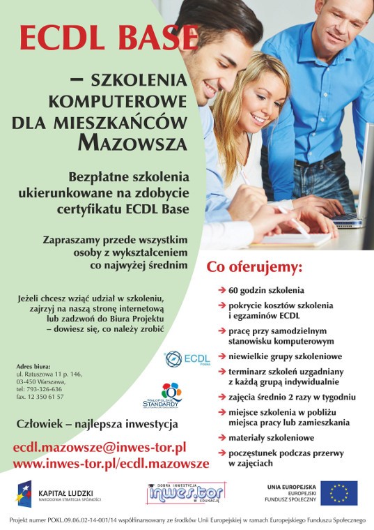 Więcej informacji uzyskać można w Biurze Projektu (tel. 793-326-636) lub na stronie www projektu - www.inwes-tor.pl/ecdl.mazowsze/ ----- Jeśli potrzebne będą dodatkowe informacje lub wyjaśnienia - prosimy o kontakt.