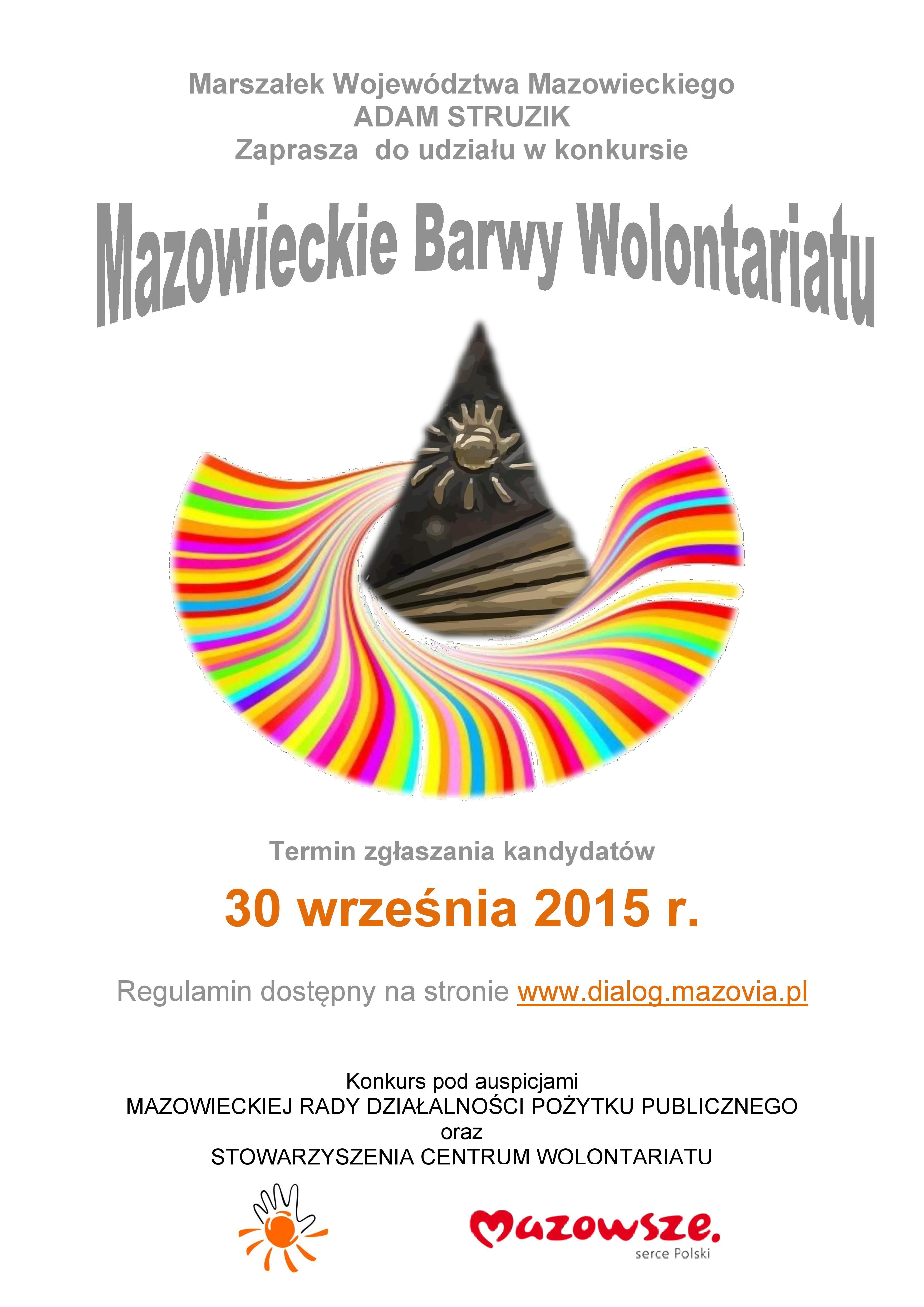 W imieniu pani Tamary Borkowskiej, pełnomocniczki Marszałka Województwa Mazowieckiego ds. współpracy z organizacjami pozarządowymi, uprzejmie informuję, że Marszałek Województwa Mazowieckiego już po raz piąty ogłosił konkurs „Mazowieckie Barwy Wolontariatu”, którego głównym celem jest promocja wolontariatu wśród mieszkańców naszego województwa.